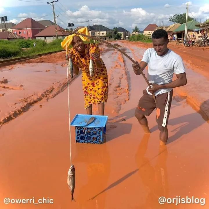 A couple has returned to the terrible Ohi-Orogwe Road in Owerri, Imo State, where they had their honeymoon in March 2021. This time they went on a fishing trip.